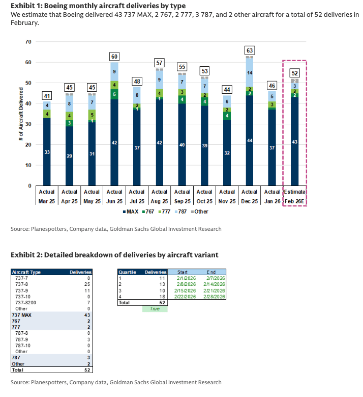 Goldman analysts led by Noah Poponak recently shared an aircraft delivery tracker with clients showing Boeing deliveries tracking at around 52 for February, including 43 737 MAX jets and 3 787s.