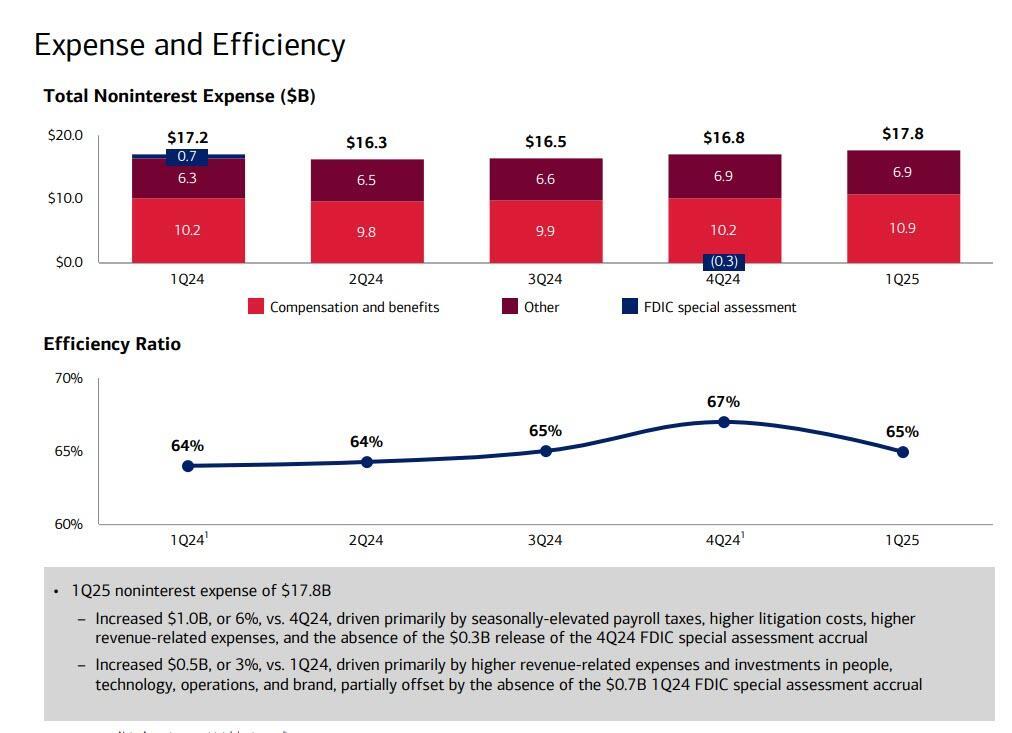 - NII increased $0.1B from 4Q24, driven by lower deposit costs, higher NII related to Global Markets (GM) activity, and fixed-rate asset repricing, partially offset by the impact of lower interest rates and ~($250MM) from two fewer days of interest accrual