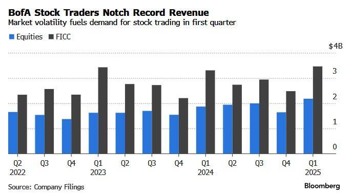 Revenue from equity trading rose 17% to $2.18 billion in the first three months of the year, helping the bank beat analysts’ estimates for per-share earnings. Meanwhile, trading of FICC (fixed income, currencies and commodities) missed estimates, bringing in $3.46 billion, below the $3.47 billion estimate.