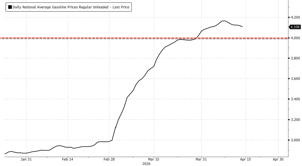 The national average for 87-octane gasoline has remained above the politically sensitive $4-a-gallon level for two straight weeks after the largest monthly jump in AAA data going back two decades. The fuel shock has Wall Street analysts focused on whether surging pump prices will begin crowding out discretionary spending.