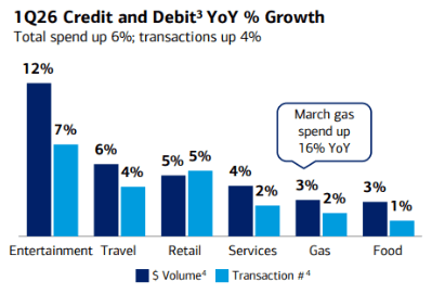 The BofA presentation Alastair cited showed that, for the first quarter, consumer spending at the pump was up 3%. For March, gas spending soared 16%. However, no meaningful spending pullbacks were visible elsewhere: Entertainment, travel, and retail spending all remained healthy, with entertainment spending rising 12% in the quarter.
