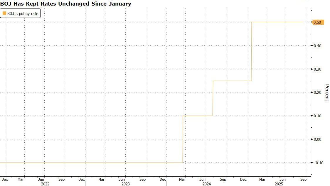 After three consecutive rate hikes since the start of 2024, the second of which sparked the biggest crash in Japanese stocks since Lehman, the BOJ has gotten cold feet and kept rates on hold since January.