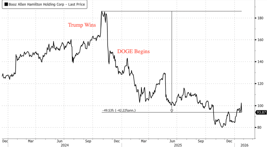 Shares of Booz Allen are down 7.5% in the cash session this morning, marking the worst single-day decline since October 24, when the stock fell about 9%. Shares have been cut roughly in half since President Trump's November 2024 election victory, as Elon Musk's DOGE initiative began aggressively targeting waste, fraud, and abuse across the federal bureaucracy in early 2025.