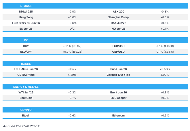 - APAC stocks were mostly higher following the gains on Wall Street; European equity futures indicate a higher cash market open with Euro Stoxx 50 futures up 0.6%.