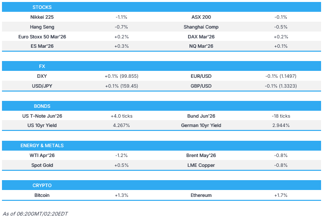 - APAC stocks were mostly subdued with the region cautious amid headwinds from the recent double-digit surge in oil prices after Iran's new Supreme Leader dug in and called for a continued closure of the Strait of Hormuz, as well as warned that other fronts will be opened if the war persists, while the US also initiated 60 Section 301 investigations related to failures to take action on forced labour.