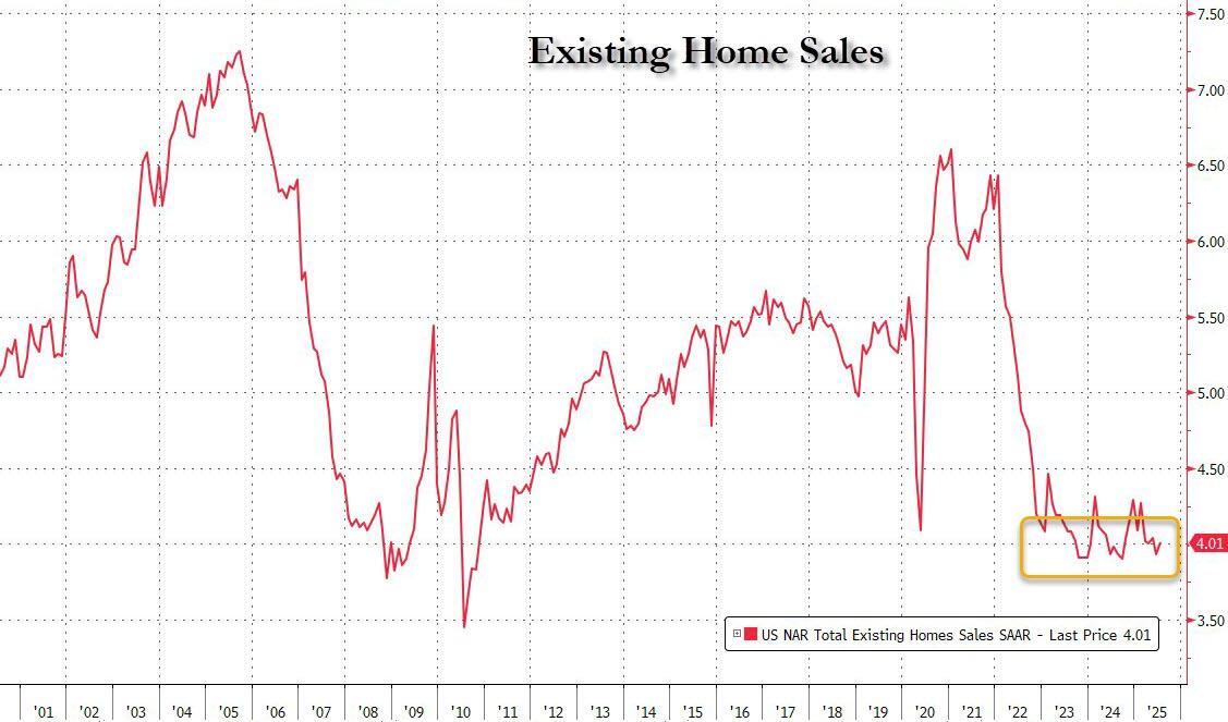 While there was a modest bounce in the total annualized pace of existing home sales from 3.93 million to 4.01 million, the number remains at 15 year lows and has been virtually unchanged for the past 3 years thanks to mortgage rates which remain in the 6%+ category.