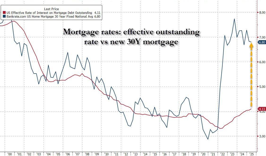 Then again, in a recent note from Goldman, the bank's economists said that 87% of mortgage holders have rates below current rates, and two-thirds have borrowing costs 2 percentage points below current rates, “strongly disincentivizing them from moving.”