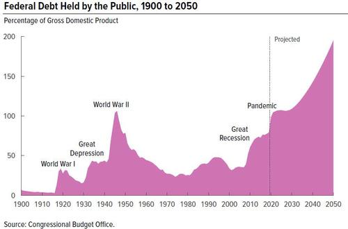Which brings us to the punchline: the amount of debt itself as projected by the CBO. As the budget agency explains "federal debt held by the public surpasses its historical high of 106 percent of GDP in 2023 and continues to climb in most years thereafter. In 2050, debt as a percentage of GDP is nearly 2.5 times what it was at the end of last year.... Relative to the size of the economy, federal debt is higher in this year’s projections than it was in last year’s projections. The economic disruption caused by the 2020 coronavirus pandemic and the federal government’s response to it contribute significantly to that difference"
