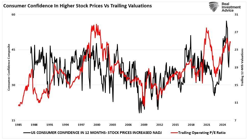 “Market valuation measures are just that—a measure of current valuation. Moreover, market valuations are a much better measure of “investor psychology” and a manifestation of the “greater fool theory.” This is why a high correlation exists between one-year trailing valuations and consumer confidence in higher stock prices.”