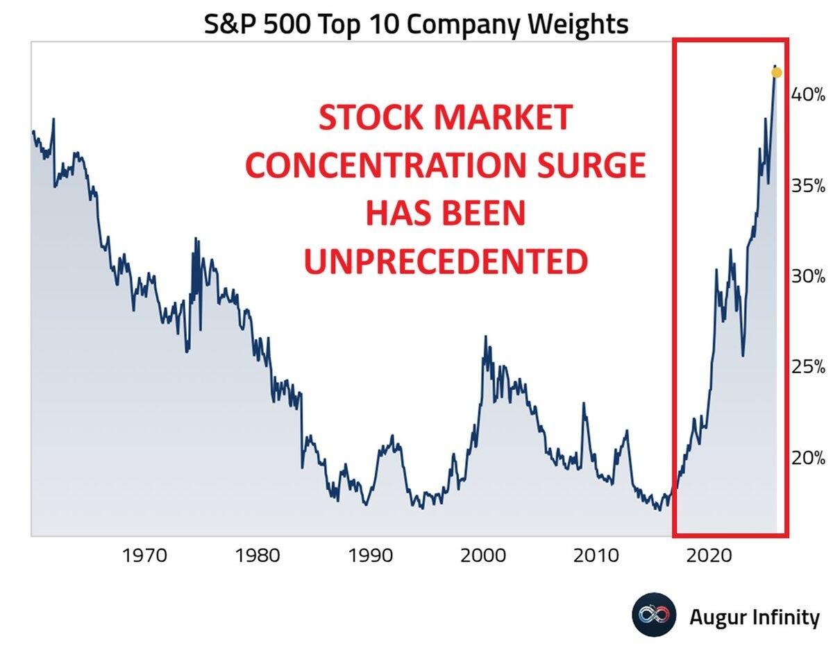 This narrow leadership is inherently unsustainable. If something occurs that causes investor flows into ETFs to reverse, every dollar sold will pull 40% out of those same 10 companies. History shows that when markets rely on a few names for returns, volatility rises, and drawdowns can be severe.