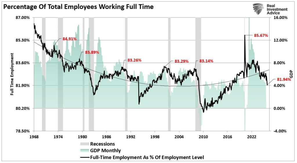 The larger economic concern is that the shift in capital allocation toward tech and automation may leave significant portions of the labor force behind. Yes, during the construction of “data centers,” we may see 5000 people employed, but only 500 are needed post-construction to operate the center. The long-term drag on employment growth will exert upward pressure on demand destruction, and we may already be seeing early signs of that.