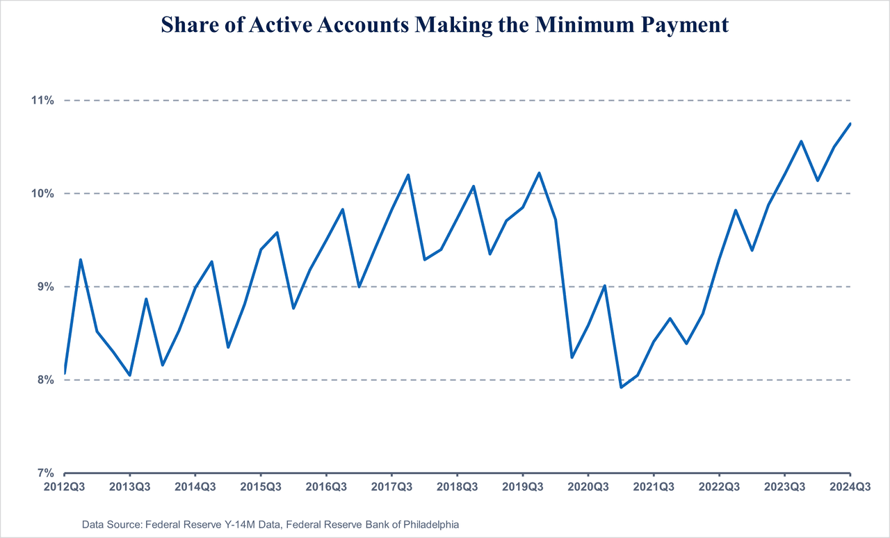 The percentage of credit card holders making only the minimum payment hit 10.75% in Q4 2024, the highest-ever reading in a Philly Fed data series that goes back to 2012.