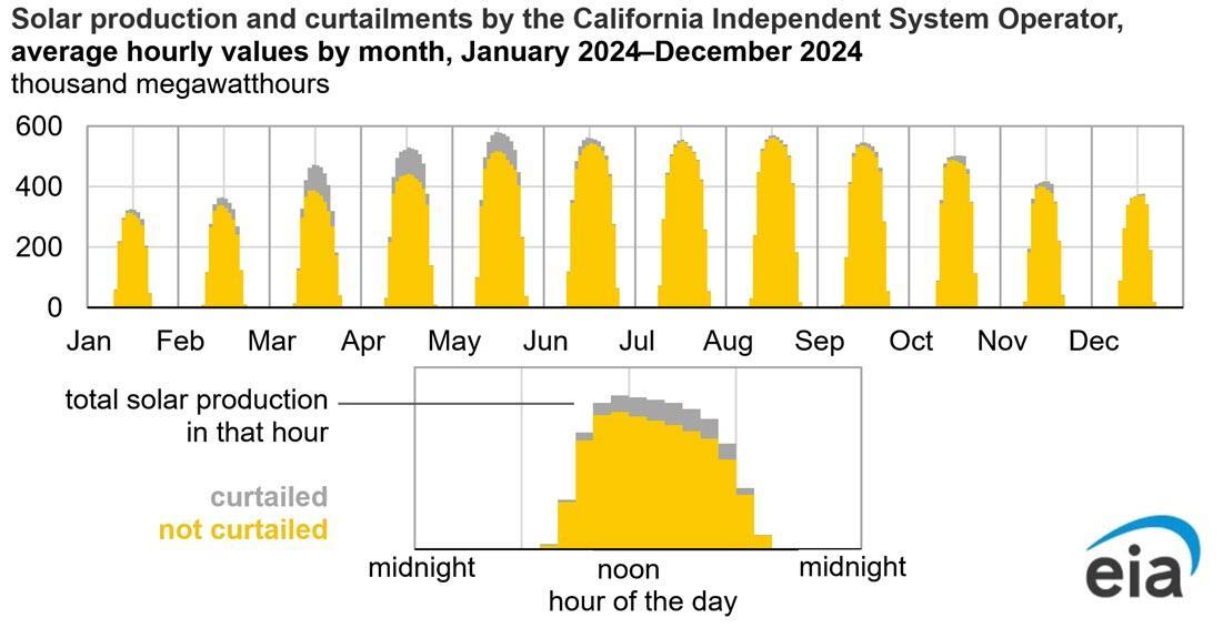 In 2024, CAISO curtailed 3.4 million megawatthours (MWh) of utility-scale wind and solar output, a 29% increase from the amount of electricity curtailed in 2023.