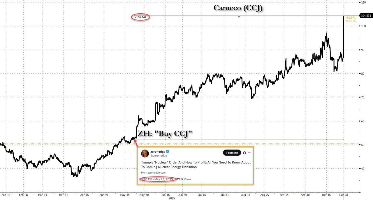 So as Trump's industiral policy rolls on, the winners are becoming increasingly clear: those who read our May 26 primer how to trade Trump's nuclear policies, and bought CCJ, have doubled their money.
