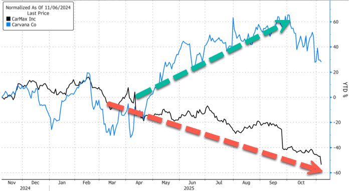 The combination of today's news sent shares tumbling as much as 15%, pushing year-to-date losses to over 57%. Meanwhile, online used-car retailer Carvana has gained more than 50% so far this year.