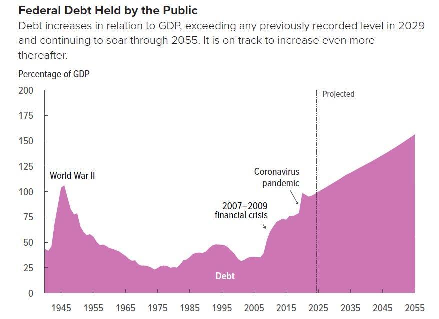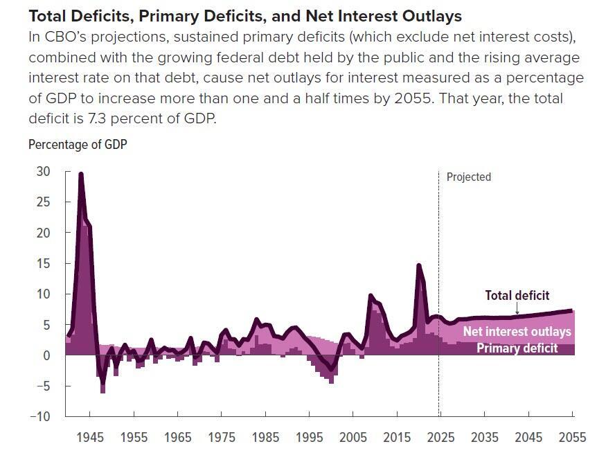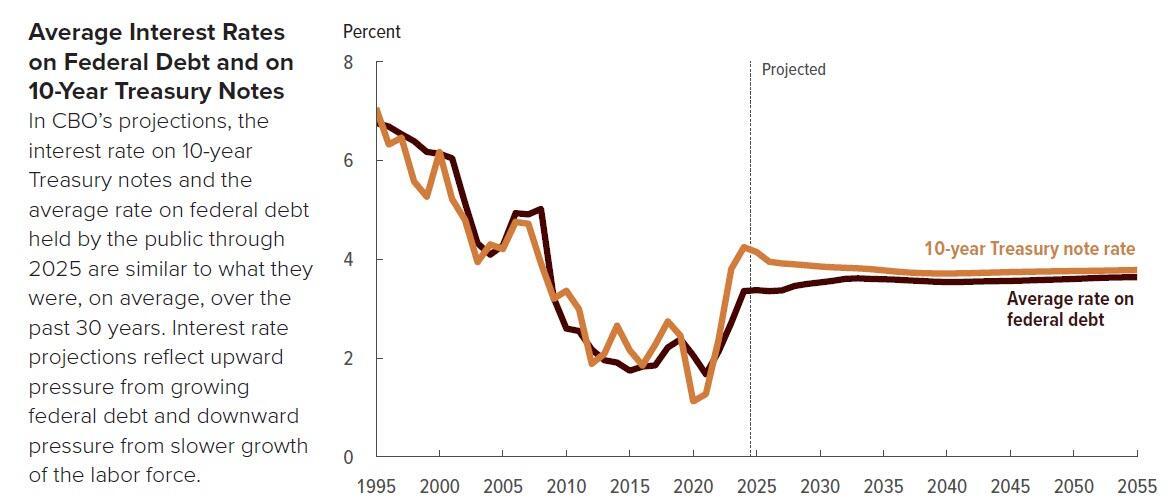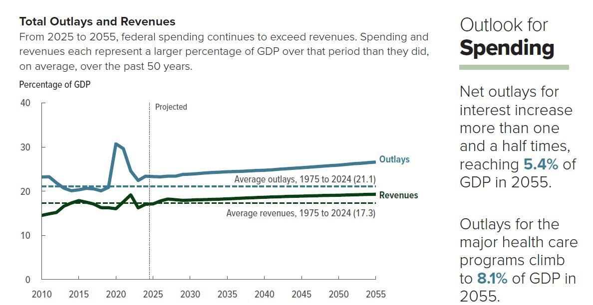 Overall, the CBO projected real economic growth, forecast at 2.1% in 2025, slowing to 1.4% in 2055.