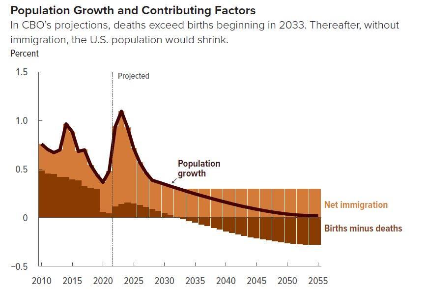 Annual deaths are projected to exceed the number of births in the US just eight years from now, at which point net immigration would drive population growth. Last year, the CBO estimated the US population would begin to shrink in 2040, but that was thanks to Biden hoovering up every Venezuelan murdered-cum-illegal alien in hopes they would vote for him.