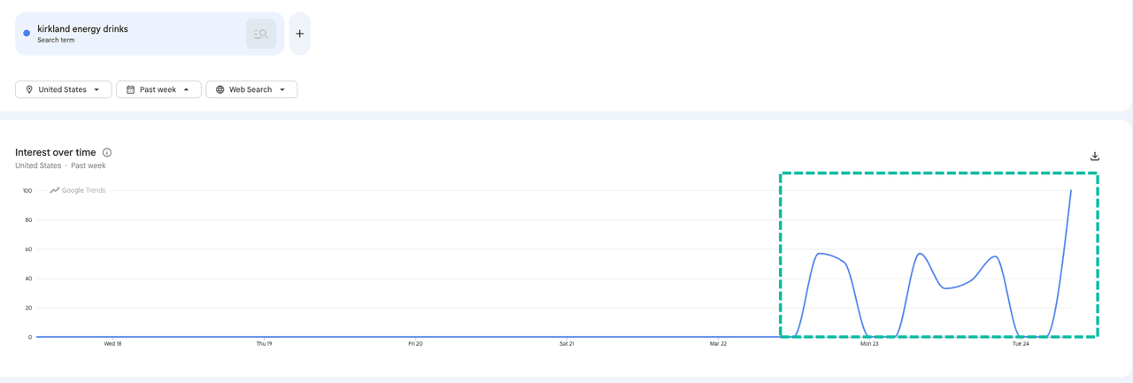 Google Search trends show that searches for Kirkland energy drink began to rise over the weekend. We suspect this trend is early in the cycle and will surge.