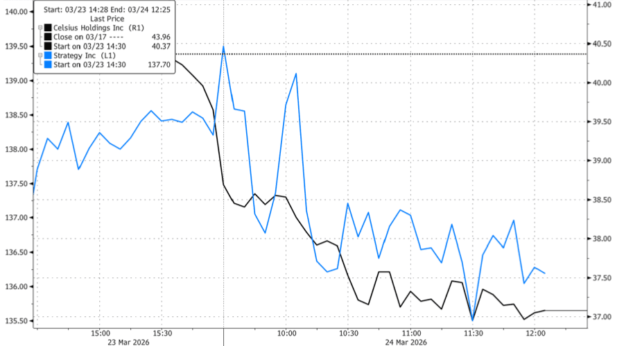 Around noon in New York, Celsius shares are trading down about 6.5%, while Monster shares are down about 1%.