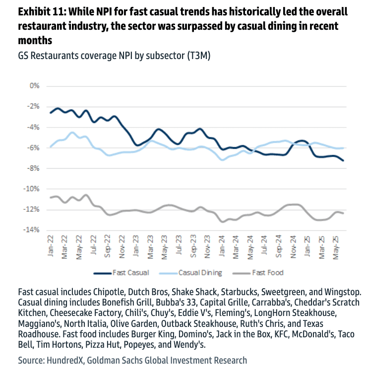 For more U.S. restaurant trends, a team of Goldman Sachs analysts led by Christine Cho posted a note for clients on Tuesday that showed Net Purchase Intent over time for three restaurant subsectors: Fast Casual, Casual Dining, and Fast Food, based on trailing 3-month averages (T3M).