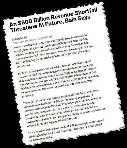 Three weeks ago, in "The Stunning Math Behind The AI Vendor Financing "Circle Jerk" (which in turn referenced our analysis from late July when seemingly nobody cared who will fund this tidal wave of looming datacenter spending), we explained how even an optimistic outlook on the AI industry and its gargantuan capex needs, reveals that there is an $800 billion funding need by the end of the decade.