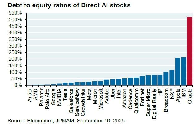 As JPMorgan's Cembalest noted, Oracle's debt to equity ratio is already 500% compared to 50% for Amazon, 30% for Microsoft and even less at Meta and Google.