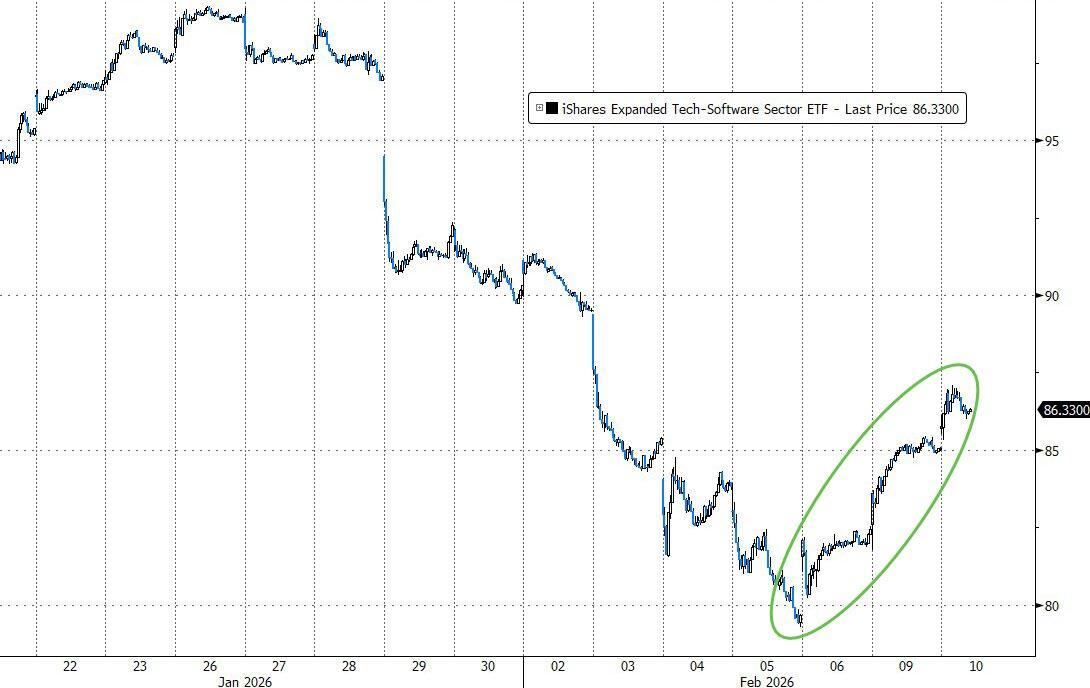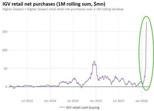 1M rolling net retail inflows into the iShares Software ETF (IGV) surged to a record $176mn as of close yesterday, more than double the prior peak seen during the late-2024 software drawdown.