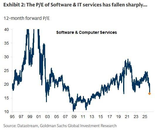 The headline-grabbing culprit for much of the pain to the downside was Software stocks (IGV as an example of an ETF that tracks the sector), which collapsed as specifically SaaS firms faced 'existential threats' from AI disruption.