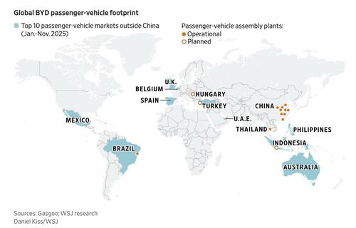 The WSJ writes that exports have become essential to absorbing this overcapacity. BYD is expanding aggressively, aiming for 2,000 European dealerships by 2026 and opening or planning factories in countries including Hungary, Turkey, Brazil, Thailand, and Indonesia. The company raised $5.6 billion to support its global push.