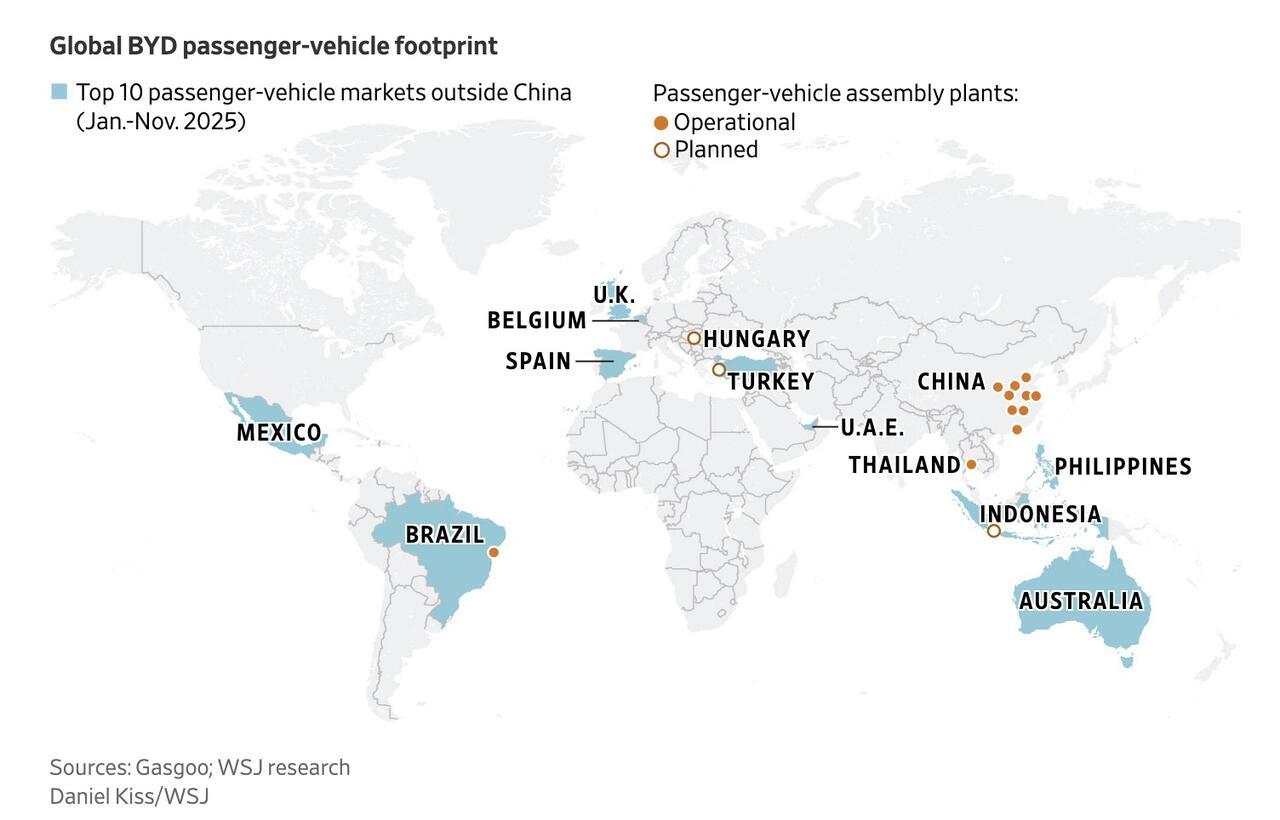 The WSJ writes that exports have become essential to absorbing this overcapacity. BYD is expanding aggressively, aiming for 2,000 European dealerships by 2026 and opening or planning factories in countries including Hungary, Turkey, Brazil, Thailand, and Indonesia. The company raised $5.6 billion to support its global push.