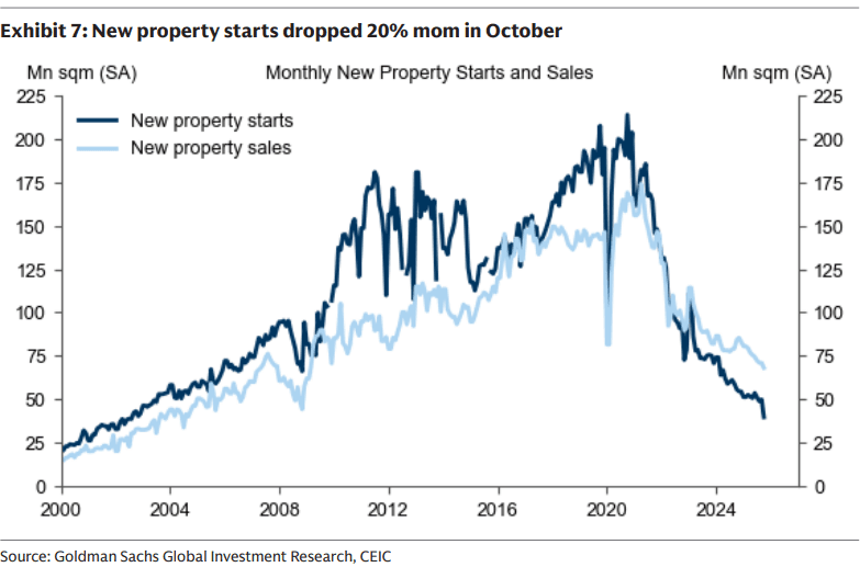 And while China tries to come up with a fix, the October economic data showed widespread weakness, especially in property and investment. Most major indicators grew less than 5% year-on-year, and property new starts declined nearly 30% yoy. We think the government may be reserving policy support for Q1 next year, since this year’s growth target appears broadly achievable.