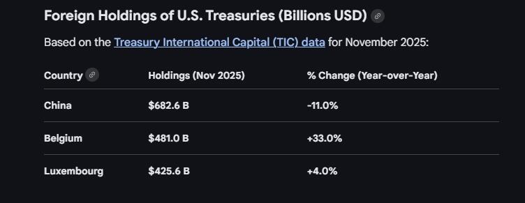 However, just because China owns U.S. Treasuries does not mean it must have custodial holdings in the U.S. Look at the same holdings table and focus on Belgium and Luxembourg. In the November 2025 snapshot, Belgium shows about $481 billion in Treasury holdings, and Luxembourg shows about $425 billion. Those are massive totals for very small countries that are not building reserves at that scale.