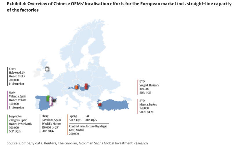 Chery & Jaguar Land Rover (JLR): Chery is reportedly exploring a manufacturing partnership with JLR that would leverage spare capacity at JLR's Halewood plant in the UK (link). The plant, which has an annual capacity of c.200,000 units, was significantly underutilized in the past few years. We estimate the average utilization rate at c.60%. This initiative would build on the existing Chery–JLR relationship, as the two companies have operated a manufacturing joint venture in China since 2012. Discussions reportedly involve the UK government and JLR leadership, and Chery has publicly highlighted the UK as a potential production base as part of its localization strategy. No definitive agreement has been announced.