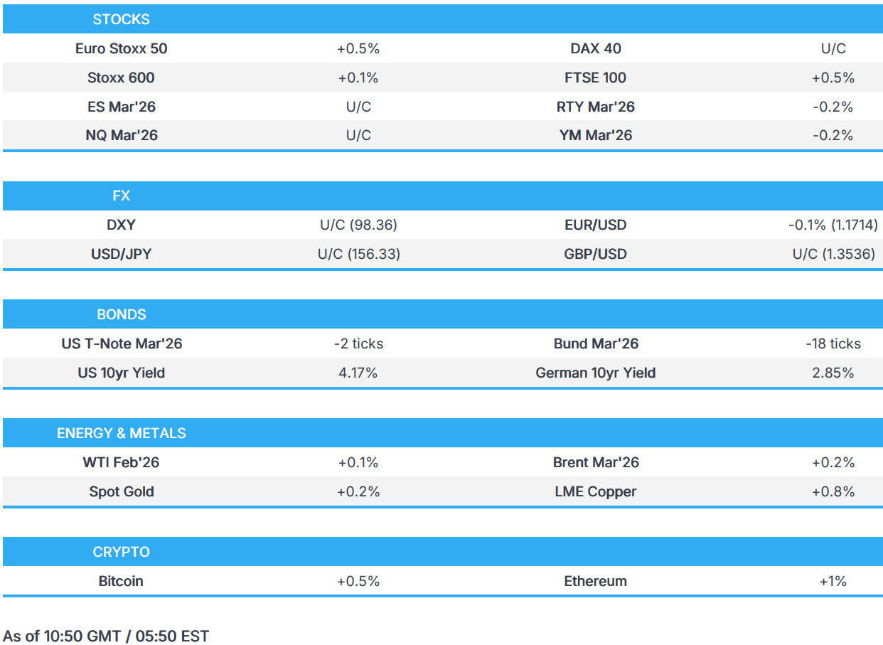 - European bourses are mostly firmer; US equity futures are mixed, with the RTY under slight pressure.