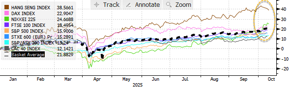 In markets, the Hang Seng Index leads global equities with a 38% year-to-date gain, while the S&P 500 is up 15.9%. On average, global stocks are up around 21.8% this year.