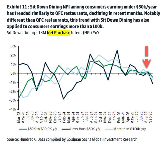 Chipotle's mounting consumer woes come as no surprise to ZeroHedge Premium and Pro subs. Early last week, we shared a Goldman Sachs survey that found low-income consumers were pulling back on spending. Here's the chart we were focused on: