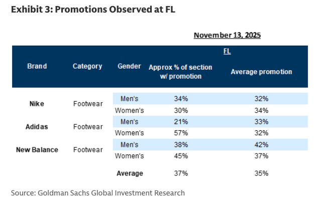 In men's, we estimate that 34% of Nike footwear was on sale with an average promotion of 32%, compared to 21% of Adidas footwear with an average promotion of 33% and 38% of New Balance footwear with an average promotion of 42%. In women's, we estimate that 30% of Nike footwear was on sale with an average promotion of 34%, compared to 57% of Adidas footwear with an average promotion of 32% and 45% of New Balance footwear with an average promotion of 37%.