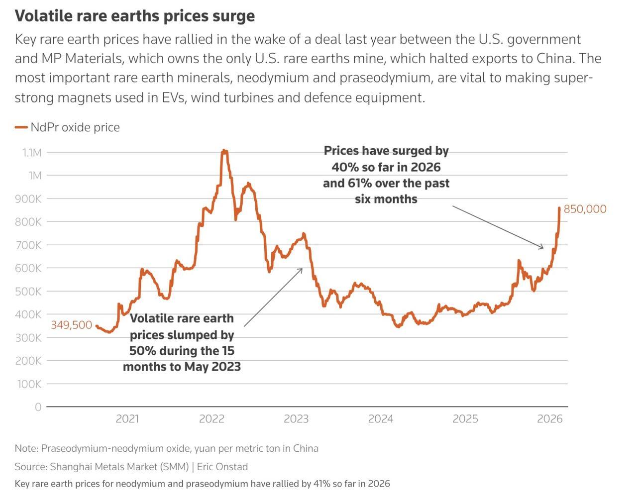 Reuters writes that volatile pricing has been a major obstacle for Western rare earth projects seeking funding. Banks have been wary of backing new mines and processing facilities because producers lack reliable ways to hedge against sharp price swings. According to Shanghai Metals Market data, NdPr prices in China have surged roughly 40% this year to their highest levels since mid-2022, after sliding by half in the 15 months through May 2023. Currently, benchmark prices are set in China and reflected in assessments by agencies including Fastmarkets and Benchmark Mineral Intelligence.