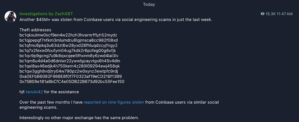 Social engineering schemes are a growing concern for Coinbase users. Blockchain security analyst ZachXBT estimated that users lost around $45 million to phishing schemes in the week leading up to May 7.