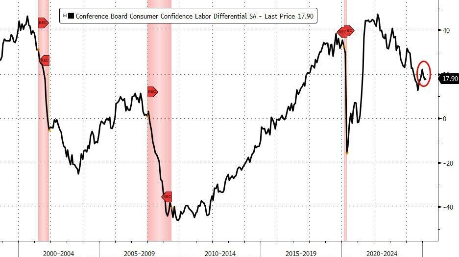 The Conference Board Consumer Confidence headline print fell from 100.1 (upwardly revised) to 92.9 (below 94.0 exp). Under the hood, it was not pretty with the measure of expectations for the next six months dropped nearly 10 points to 65.2, the lowest in 12 years, while a gauge of present conditions declined more modestly.