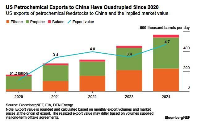 China imported more than 565,000 barrels per day of petrochemical feedstocks from the US in 2024 according to the Energy Information Administration, with a value of over $4.7 billion. That dwarfed the $170 million of rare earths the US imported last year, about 70% of which came from China, according to the US Geological Survey.