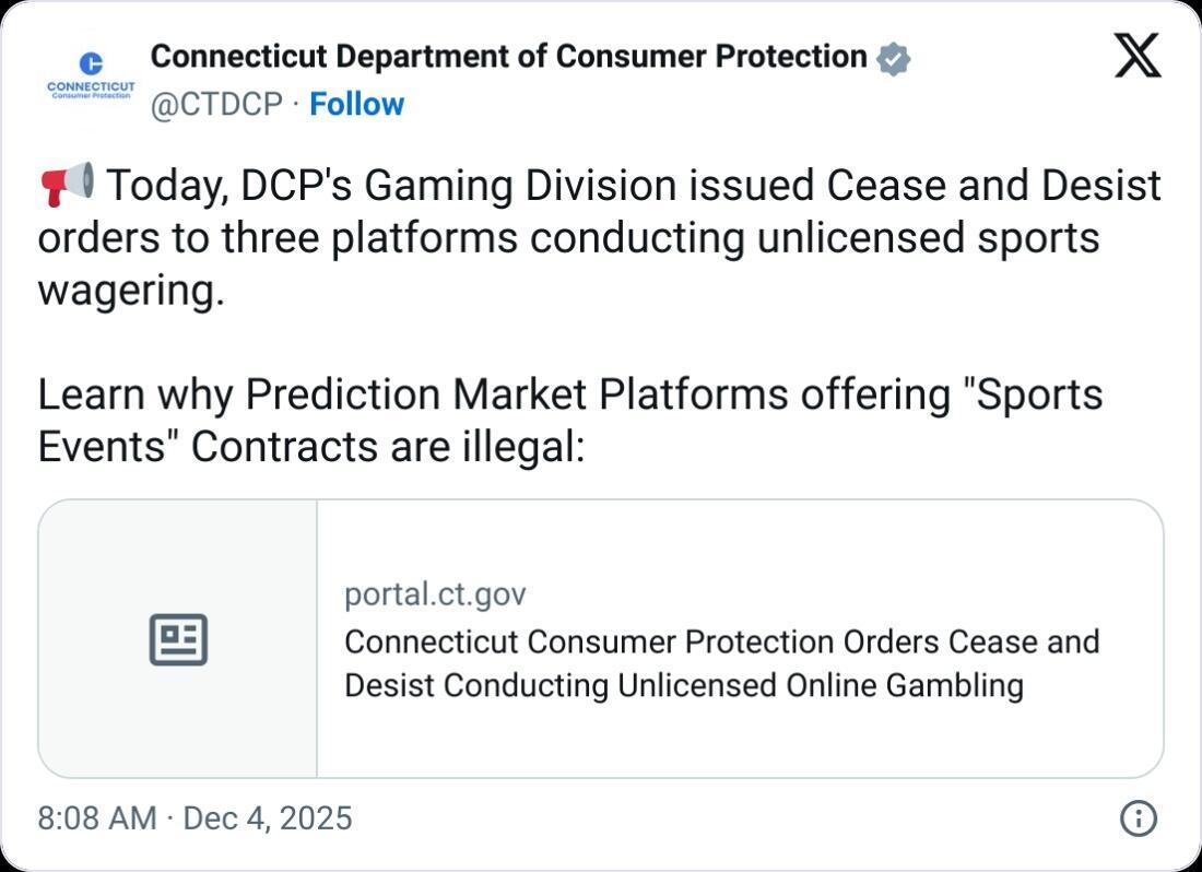 In its statement, Connecticut’s DCP said that prediction market platforms pose serious risks to consumers because they lack the required technical standards and security protections for financial and personal data.