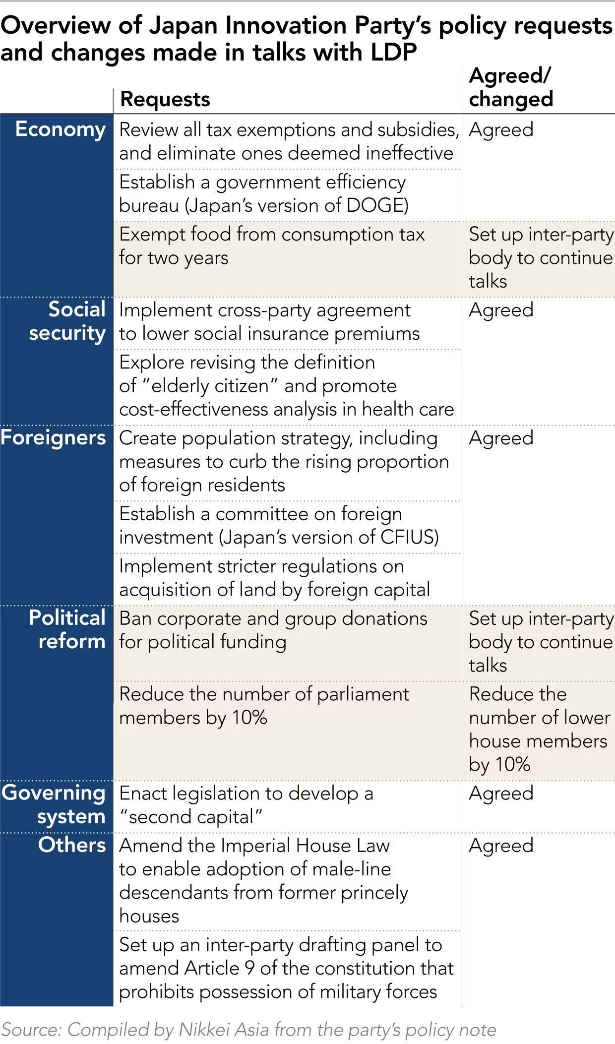 In Monday's deal, Japan Innovation secured "nearly full agreement" on most of the 12 policy areas where it demanded change -- from social security reforms to the establishment of a "second capital" to move certain government and economic functions away from Tokyo -- according to the party's co-leader, Fumitake Fujita.