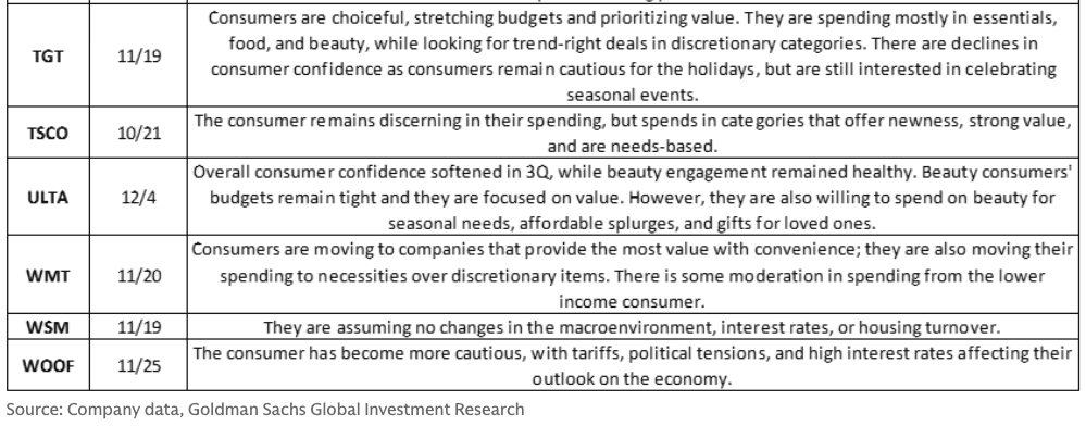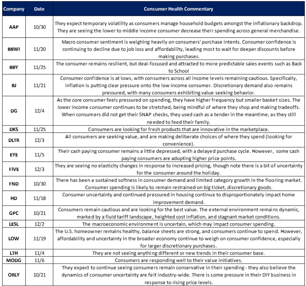All commentary below from retailers reinforced the picture of a bifurcated consumer, with lower- and middle-income households tightening, value retailers benefiting from trade-downs, and discretionary or larger-ticket categories seeing demand slowdowns.