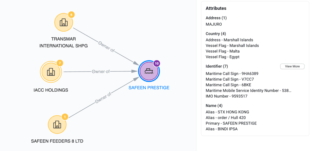 The Safeen Prestige is owned by Transmar International Shipping of Egypt and managed by GFS Ship Management of Dubai, according to the maritime blog TradeWinds. It is also listed as a Maltese-flagged container ship on VesselFinder.