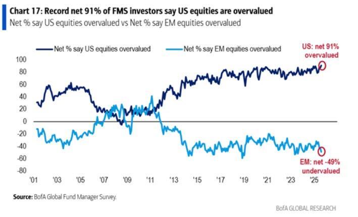 The first graph shows that a record 91% of fund managers believe the US equity markets are overvalued.