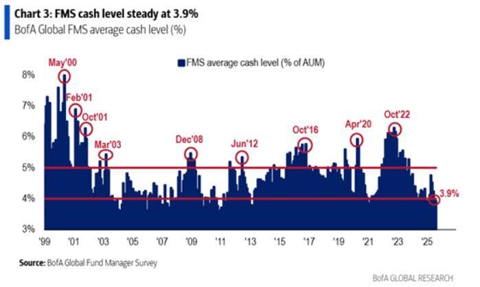 Yet, despite their valuation stance, they are nearly fully invested as judged by the near record-low cash balances in the second graph.