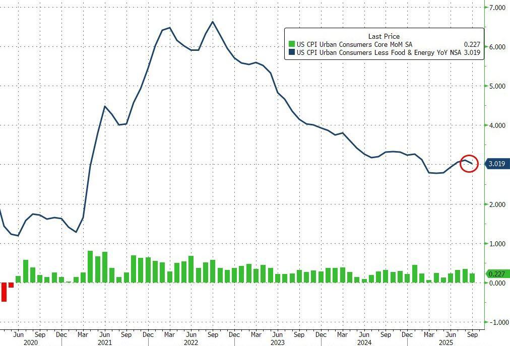 A similar pattern was seen in Core CPI data with the print rising 0.2% MoM (below expectations of +0.3%), but pulled the YoY print down to 3.0% (down from 3.1% in August), the lowest since June...