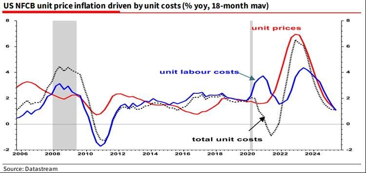 “Unit labour cost inflation, which economists regard as the key source of cost push inflation, has slowed to below 1%, suggesting that the sharp fall in NFCB (non-financial corporate business) inflation is not anomalous.”