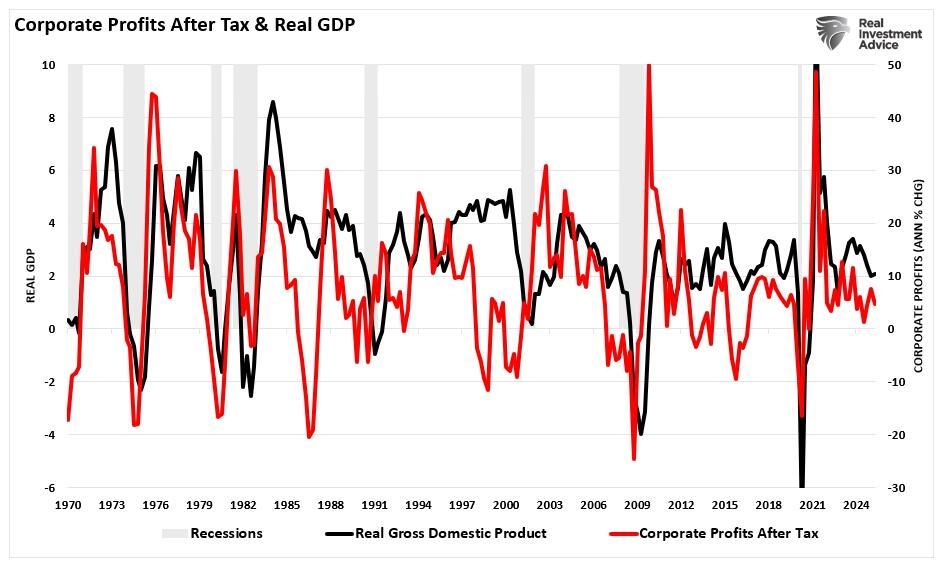 Regular readers of our work at RealInvestmentAdvice will remember we’ve been writing for years that profits and the economy move together over complete cycles, and that revenue and profits don’t levitate indefinitely above economic capacity. The thread through my prior pieces, specifically on Kalecki’s profit identity, is the detachment of markets from fundamentals. The earnings-economy linkage, fiscal impulses, savings behavior, and trade balances can push profits temporarily above trend, but gravity eventually reasserts itself.